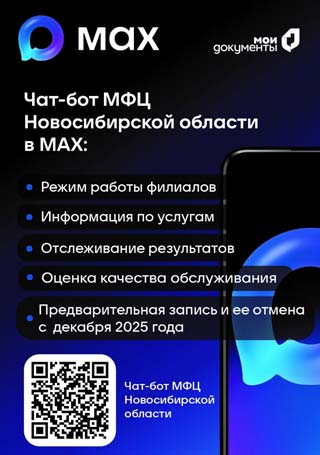 Чат-бот МФЦ Новосибирской области в МАХ — ваш надежный помощник в сфере госуслуг! Для удобства заявителей в МФЦ Новосибирской области функционируют различные цифровые сервисы. Среди них — чат-бот МФЦ Новосибирской области на отечественной площадке МАХ. С помощью чат-бота МФЦ НСО в МАХ граждане могут получить информацию об услугах, узнать режим работы филиалов, проверить статус дела и оценить качество обслуживания. С декабря 2025 года заявителям будет доступна новая функция в чат-боте — предварительная запись в филиалы МФЦ Новосибирской области. Дополнительно всем пользователям МАХ при подаче документов в филиалах МФЦ автоматически поступает оповещение о готовности результатов в режиме реального времени, исключая необходимость самостоятельно проверять статус дела. Напомним, что МАХ — отечественный мессенджер, обеспечивающий высокое качество аудио-и видеозвонков. У групповых звонков нет ограничений по длительности и количеству участников. Приложение входит в реестр российского программного обеспечения. Преимущества MAX: денежные переводы прямо в чатах, надежные настройки приватности, бесплатная отправка файлов до 4 ГБ, чаты и каналы можно сортировать по папкам, ИИ-помощник, сервис планирования путешествий и другие полезные функции.